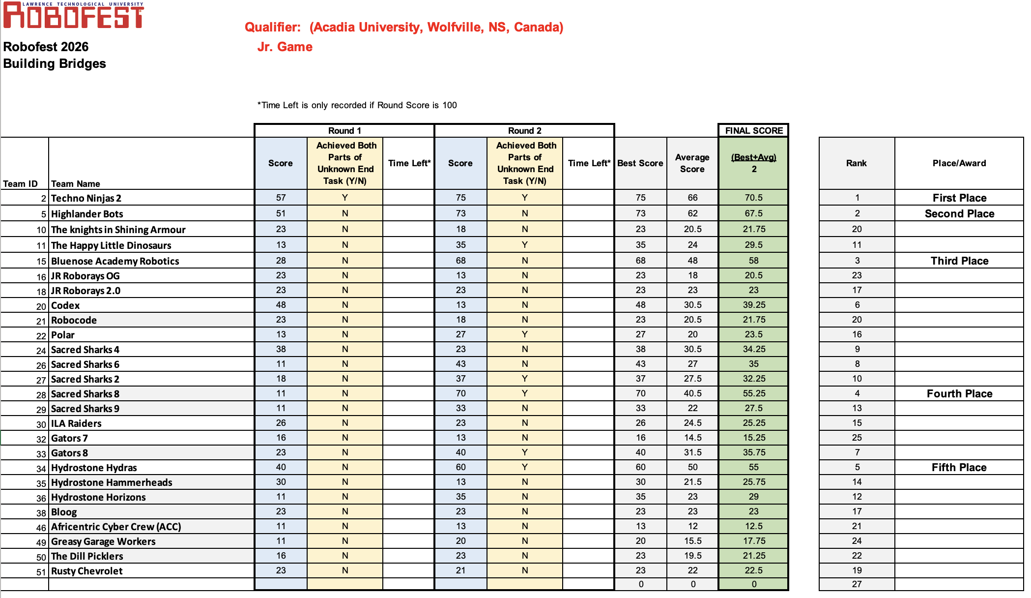Please take the chance to take a look at the 2026 ROBOFEST Junior Division scores. If you have any questions feel free to contact Hannah.fisk@acadiau.ca or Sadia.tasneem@acadiau.ca